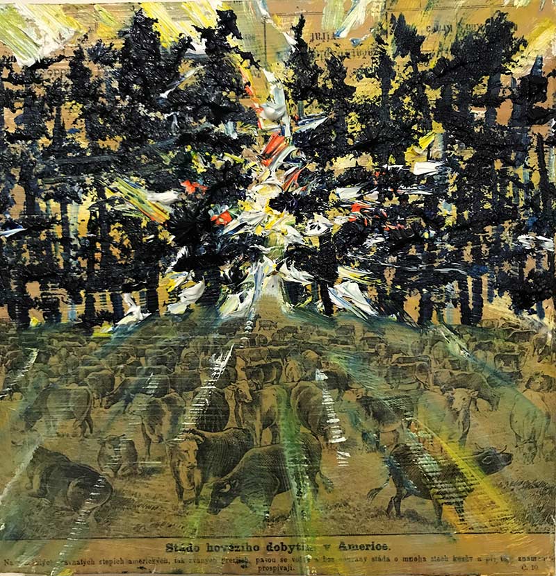 "I collage vintage materials as a background for landscapes and figures in