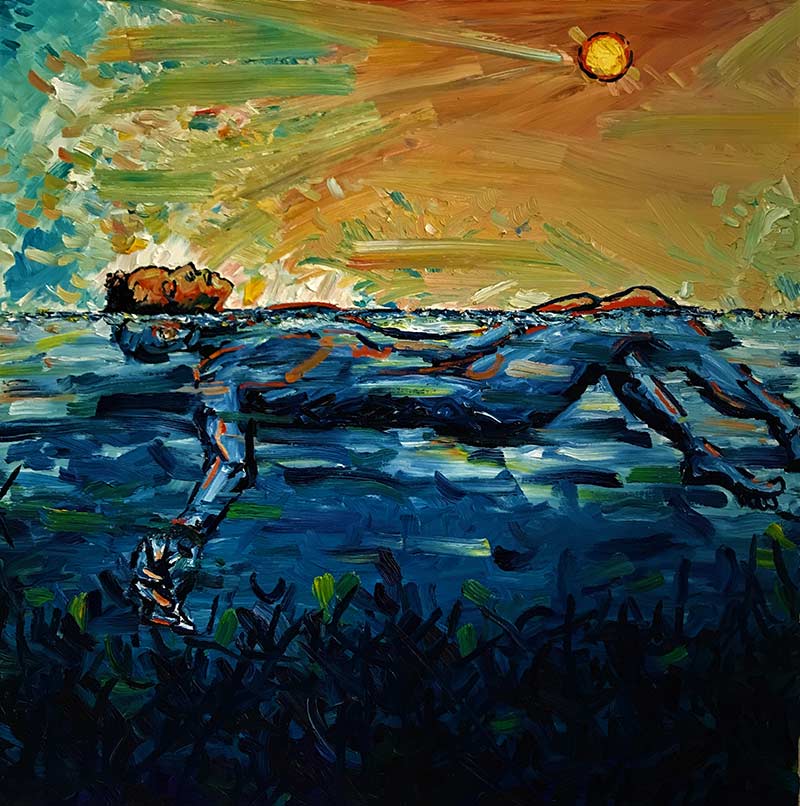 I identify with my piece, “I Swam Across the Atlantic” (2019), right now. I learned to swim within the past few years. I was so afraid of deep water. Not touching the ground, not seeing the bottom, it felt like drifting into the unknown. I mastered floating. And then, this past summer in Croatia, I mastered wading in deep water. It was so incredibly liberating. I felt safer being in control of my body and what I gave it freedom to do so naturally. I painted “I Swam Across the Atlantic” because it represented this moment. But it also represents all those Africans kidnapped and forced across the Atlantic and did not make it, their bodies in graves beneath the waves. And somehow, my Ancestors landed on the opposite shoreline, surviving with so much zeal and courage that I can leisurely float in those very waters today.