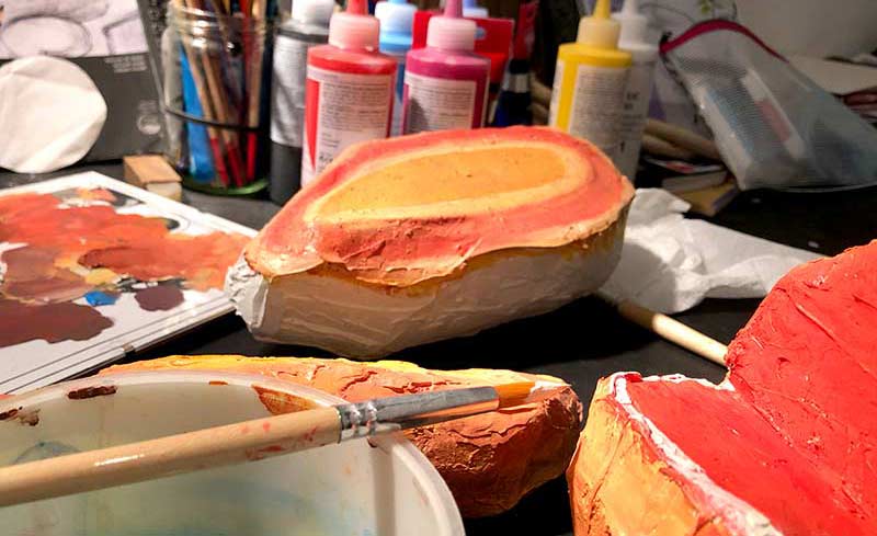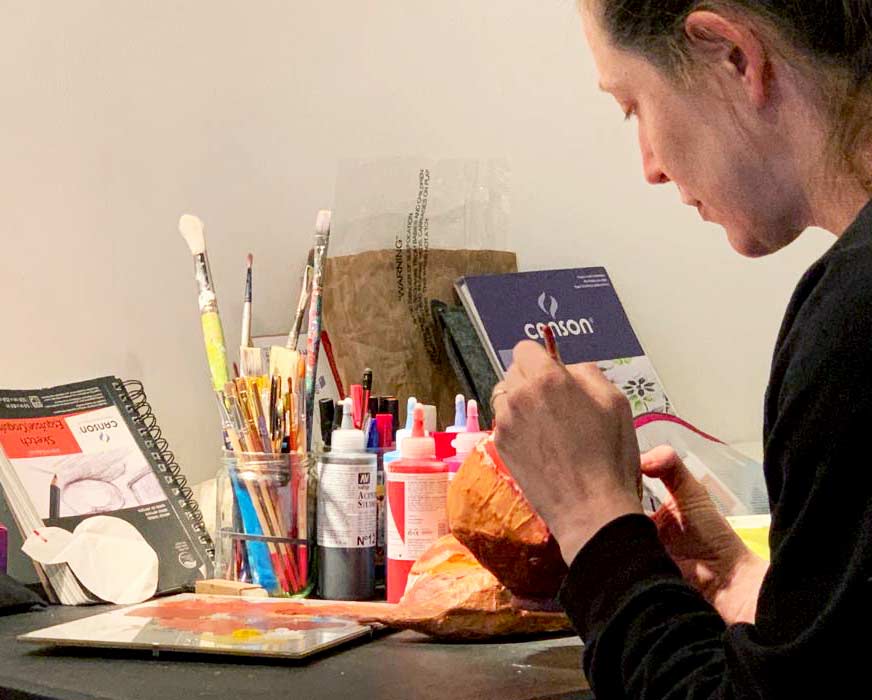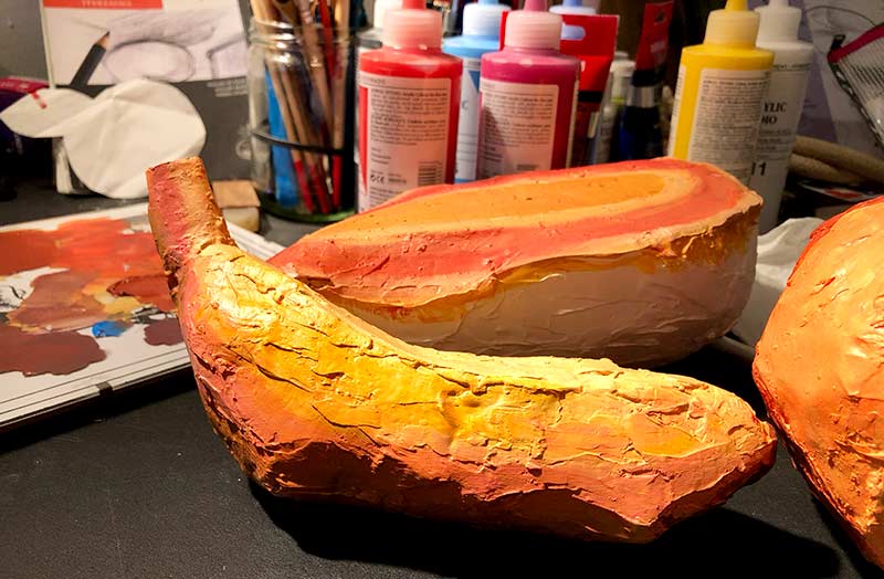 I'm an artist and illustrator, a wife, and new mother. I work as an illustrator for my day job, and I make art in my other time. I like to make my work with paper mache, or real food, and sometimes I make paintings with oil, acrylic, or gouache. I'm most interested in the way we eat, the way food unites or divides us; it serves as a metaphor for relationships, for feelings, emotions, and more.