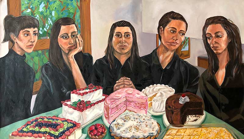 “If one of my pieces were to come to life, I think it would be interesting if it was the painting "Not Eating with Myself, Not Myself". It is a painting of 5 distorted versions of myself in front of a table of cakes. I think it would be interesting to meet those distorted versions of me and find out more about them.”